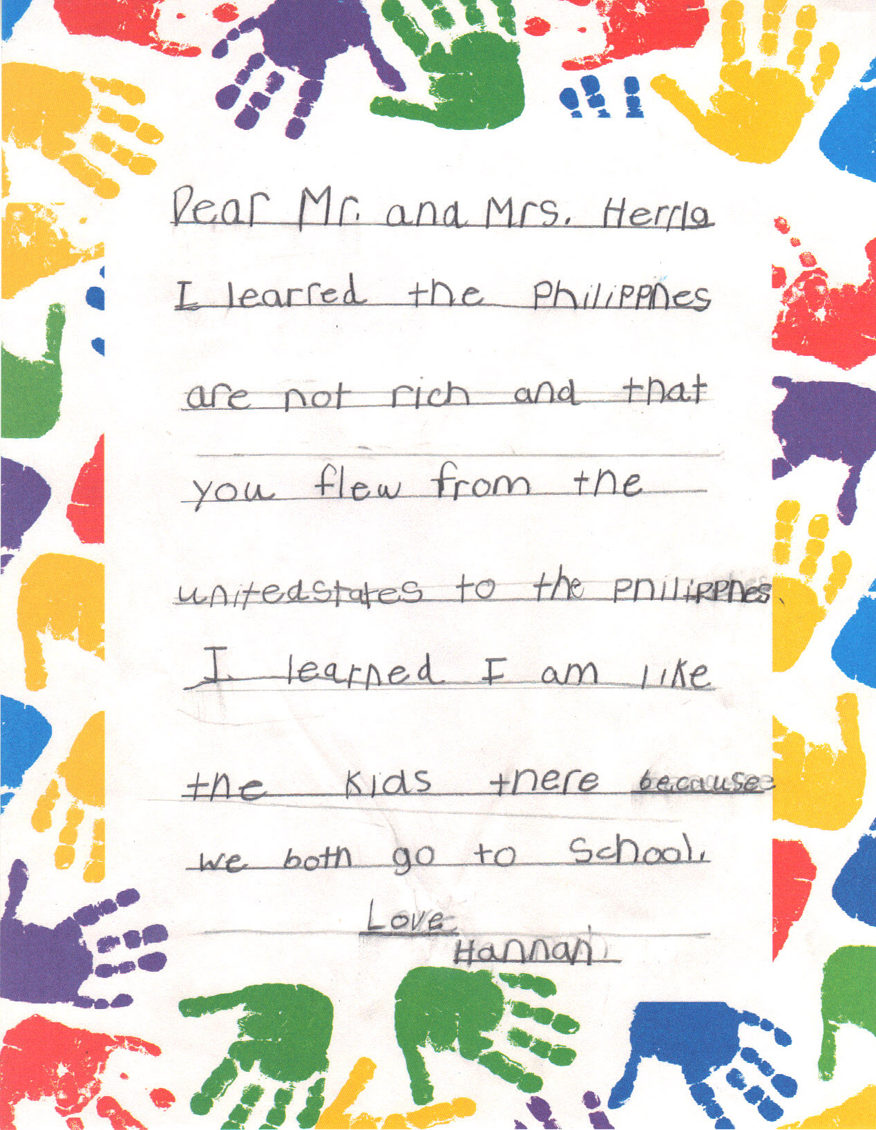Shortly after returning from the Philippines, I had the opportunity to share with my niece Katie Maneman about George’s and my trip. Katie is a second grade teacher at Carver Elementary in Dubuque, Iowa. She is an enthusiastic teacher with a heart for her students looking for opportunities to not only teach them but also make them better individuals in the process. She immediately extended an invitation to George and I to come and talk to her students.
