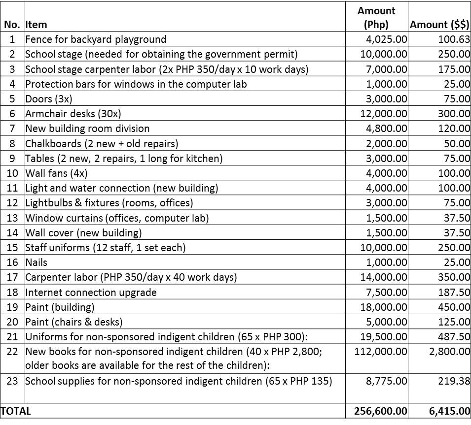 Therefore, we have put together a list of the needs for the renovation and preparation of the new school addition. The list also includes the costs for books and uniforms for the non-sponsored children. Please remember that the vast majority of our students are those that are classified “indigent” by the Philippine Government. This classification is given to families that barely have enough for food and shelter.